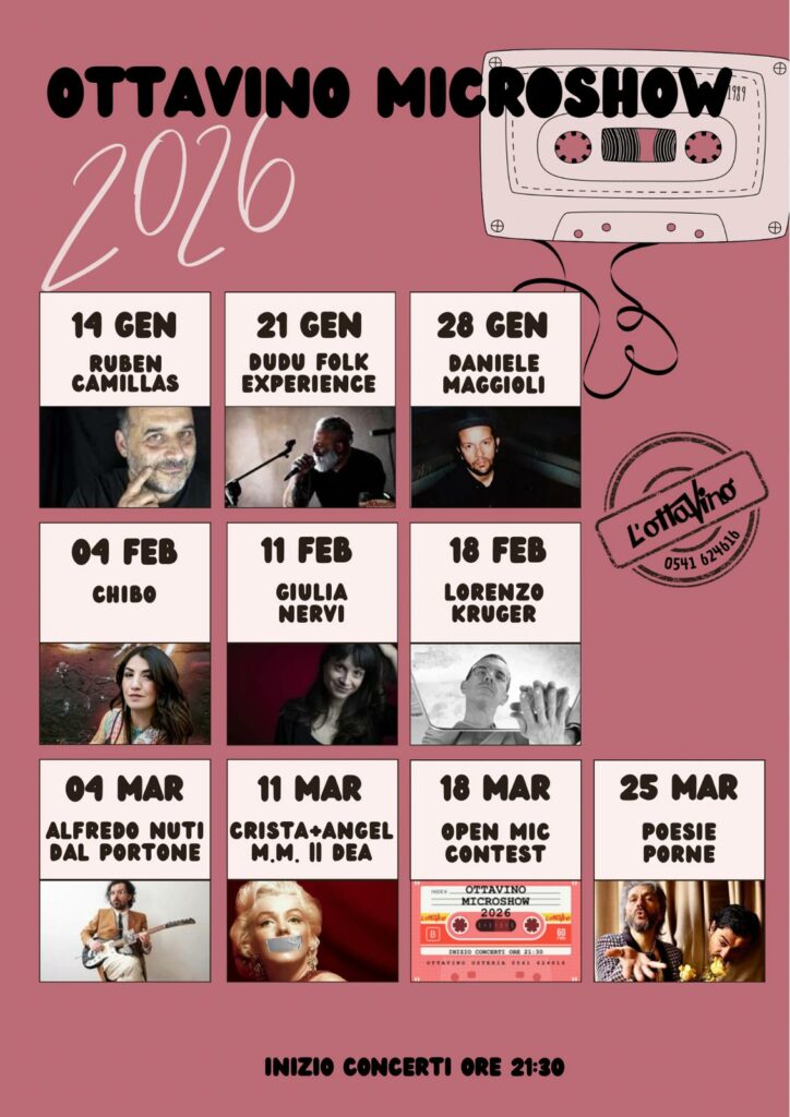 L’Ottavino MicroShow è felice di presentarsi per il suo secondo anno con un bellissimo programma di 10 serate di musica e spettacolo che daranno vita al nostro inverno sul palco dell’Ottavino osteria quotidiana. Anche quest’anno il nostro direttore artistico Antonio Ramberti ha creato un programma di qualità con artisti unici nel panorama italiano. Il programma inizierà Mercoledì 14 Gennaio con Ruben Camillas, musicista, autore e performer unico nel panorama della scena indipendente italiana. Proseguirà, il 21 Gennaio, con Davide Dudu Morandi (cantante dei Modena City Ramblers) e il suo gaucho Iosonomoka con il loro progetto “Cuntafol”, un racconto di storie nel dialetto dell’appennino modenese. Memorie e racconti in musica e parole tra la via Emilia e l’oceano Atlantico, storie di adolescenza e di resistenza, di ribellione e di speranza. Chiuderà il mese di Gennaio, mercoledì 28, Daniele Maggioli, notissimo artista riminese che presenterà il suo nuovo album “Oltre lo Specchio”, un album intimista e visionario che nasce dal bisogno di raccontare il nostro tempo e le sua pressioni. “In Oltre lo Specchio c’è il suono inafferrabile della verità. Oltre lo specchio nulla è come appare: città, occhi, voci. Tutto è inedito, mai visto…”